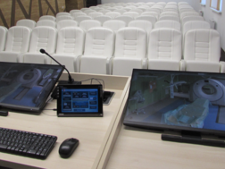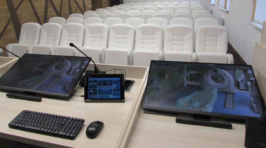 Локальное управление аудиовизуальными системами осуществляется через тач-панели Extron и беспроводные планшеты Lenovo с интуитивно понятным интерфейсом, специально разработанным для НПЦ хирургии и трансплантологии.